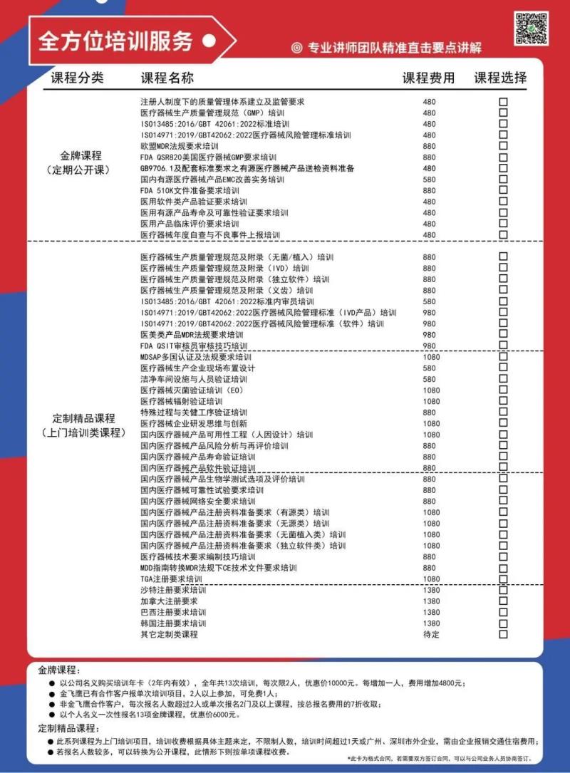 培訓(xùn)分為定期線下公開課上門培訓(xùn)兩種形式,共有13節(jié)金牌課程+34節(jié)定制精品課程(詳見下方海報(bào),課程主題涵蓋了醫(yī)療器械國內(nèi)外注冊(cè)及體系的多個(gè)環(huán)節(jié)、多個(gè)領(lǐng)域,優(yōu)選金飛鷹具備豐富專業(yè)知識(shí)及實(shí)戰(zhàn)經(jīng)驗(yàn)的技術(shù)及項(xiàng)目老師,為學(xué)員提供全方位、高質(zhì)量的醫(yī)療器械注冊(cè)指導(dǎo)。感興趣的可掃描下方二維碼報(bào)名哦~