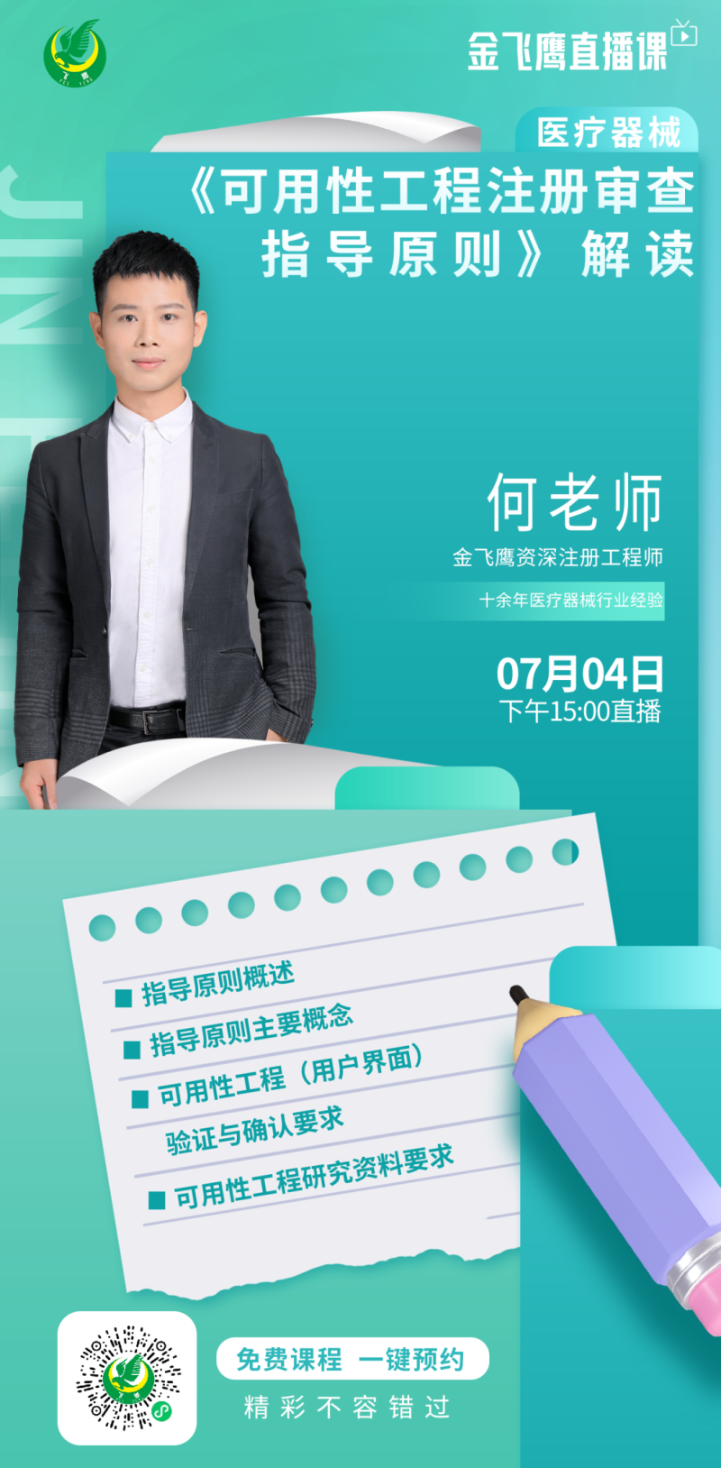 7月4日下午3點(diǎn),金飛鷹資深注冊(cè)工程師,擁有十余年醫(yī)療器械行業(yè)經(jīng)驗(yàn),對(duì)可用性工程頗有研究的何老師,給大家?guī)怼夺t(yī)療器械可用性工程注冊(cè)審查指導(dǎo)原則》解讀,培訓(xùn)內(nèi)容包括指導(dǎo)原則概述、指導(dǎo)原則主要概念、可用性工程(用戶界面)驗(yàn)證與確認(rèn)要求、可用性工程研究資料要求,大家千萬不要錯(cuò)過了哦!