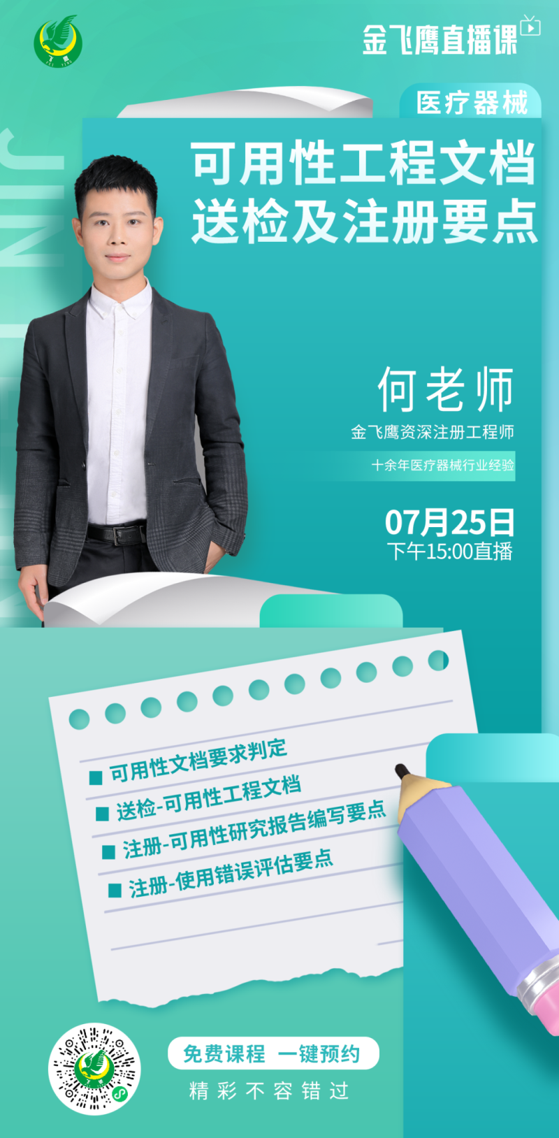 7月25日下午3點,金飛鷹資深注冊工程師,擁有十余年醫(yī)療器械行業(yè)經(jīng)驗,對可用性工程頗有研究的何老師,繼續(xù)給大家?guī)怼夺t(yī)療器械可用性工程文檔送檢及注冊要點》,培訓(xùn)內(nèi)容包括可用性文檔要求判定、送檢環(huán)節(jié)的可用性工程文檔要求、注冊環(huán)節(jié)的可用性研究報告編寫要點及使用錯誤評估要點,大家千萬不要錯過了哦!