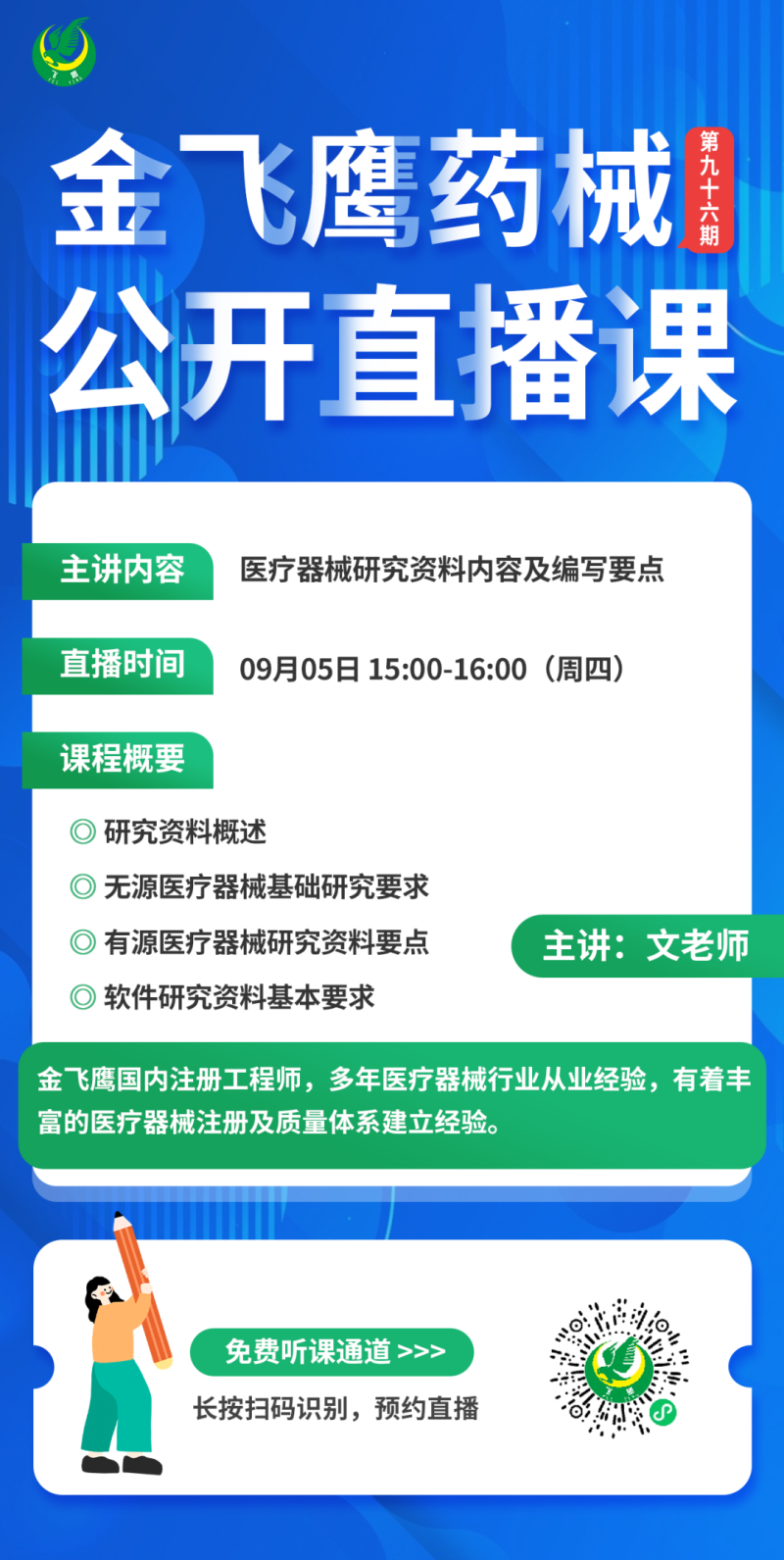 9月5日下午3點,金飛鷹國內注冊工程師,有著豐富的醫(yī)療器械注冊及質量體系建立經驗的文老師,給大家?guī)怼夺t(yī)療器械注冊入門知識分享-研究資料內容及編寫要點》,培訓內容包括研究資料概述、無源醫(yī)療器械基礎研究要求、有源醫(yī)療器械研究資料要點、軟件研究資料基本要求,大家千萬不要錯過了!