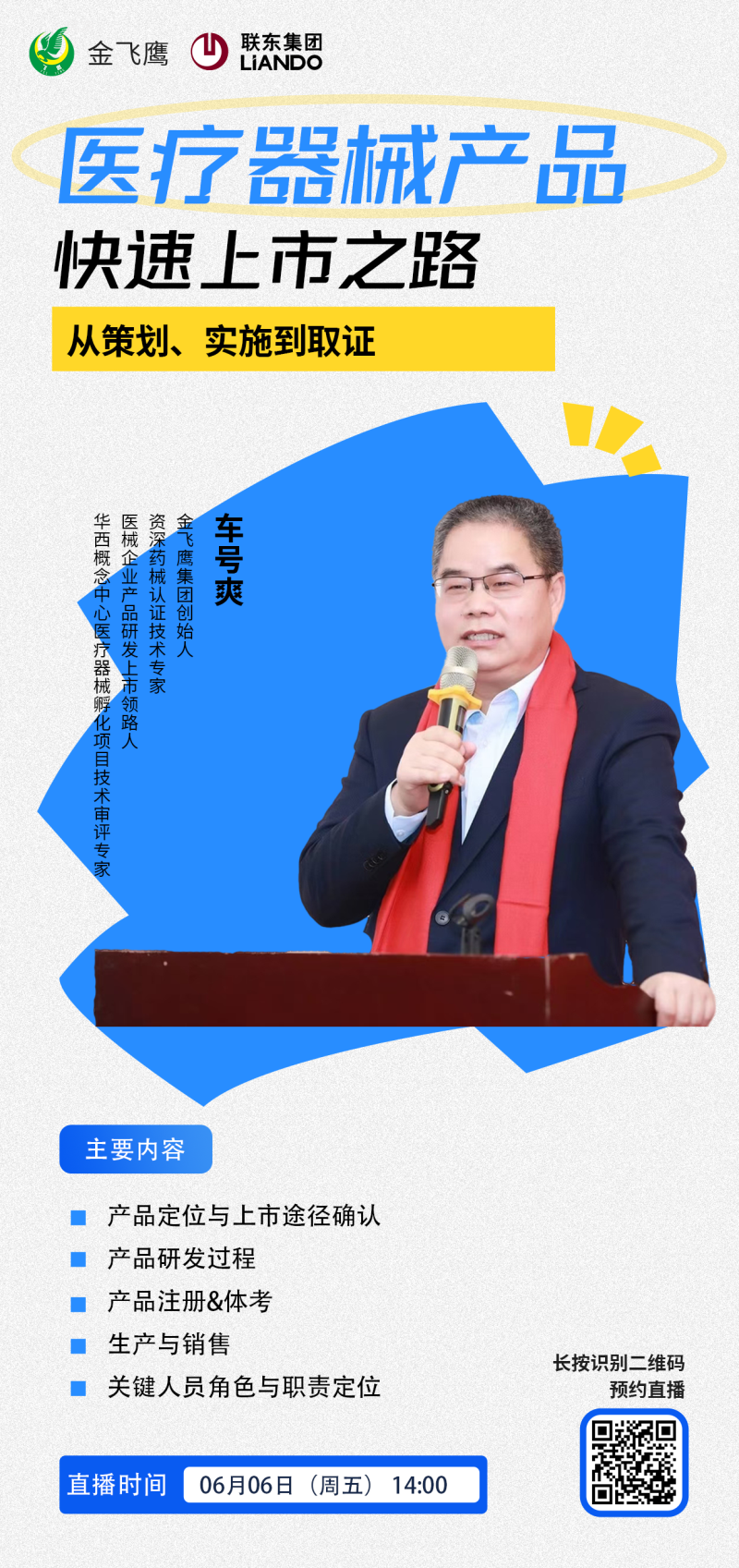 今年4月,金飛鷹與成都聯(lián)東U谷聯(lián)合主辦了一場線下培訓,得到了園區(qū)企業(yè)的一致好評?;谇捌诹己玫暮献骰A,金飛鷹與聯(lián)東U谷產(chǎn)業(yè)園區(qū)的合作進一步深化升級。6月6日,我們將面向全國聯(lián)東U谷產(chǎn)業(yè)園區(qū)的醫(yī)療器械企業(yè),開展“醫(yī)療器械產(chǎn)品快速上市之路”線上專題培訓,由集團創(chuàng)始人車號爽老師進行分享,并通過“金飛鷹集團”視頻號同步直播。車老師將結合金飛鷹18年來積累的4000+成功案例,為企業(yè)提供可落地執(zhí)行的實操指導,幫助企業(yè)優(yōu)化注冊申報流程,縮短產(chǎn)品上市周期,提升市場競爭力。