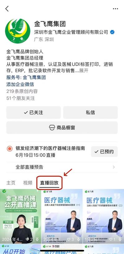 往期直播培訓課程支持回放,關注“金飛鷹藥械咨詢服務”視頻號并點擊視頻號主頁,即可查看“直播回放”哦~