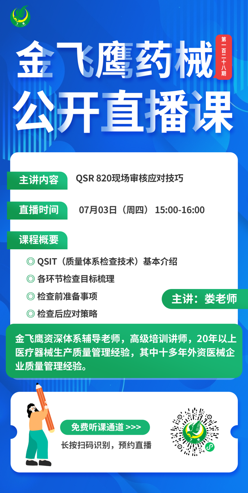 7月3日下午3點(diǎn),金飛鷹資深體系輔導(dǎo)老師、有著十多年外資醫(yī)械企業(yè)質(zhì)量管理經(jīng)驗(yàn)的婁老師給大家?guī)?lái)《QSR 820現(xiàn)場(chǎng)審核應(yīng)對(duì)技巧》,他將從QSIT(質(zhì)量體系檢查技術(shù))的基本介紹出發(fā),深入解析FDA現(xiàn)場(chǎng)檢查的核心要點(diǎn)。在此基礎(chǔ)上,本次課程還將給出企業(yè)在檢查前及檢查后的準(zhǔn)備事項(xiàng)及應(yīng)對(duì)策略,為企業(yè)應(yīng)對(duì)FDA檢查打下堅(jiān)實(shí)基礎(chǔ)。