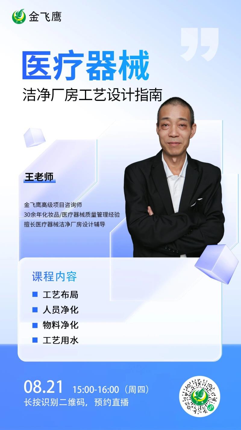 8月21日下午3點,金飛鷹高級項目咨詢師,有著30余年化妝品/醫(yī)療器械質(zhì)量管理經(jīng)驗,尤為擅長醫(yī)療器械潔凈廠房設(shè)計輔導(dǎo)的王老師給大家?guī)怼?/span>醫(yī)療器械潔凈廠房工藝設(shè)計指南》,無論您是正在規(guī)劃新的生產(chǎn)場地,還是希望提升現(xiàn)有廠房的運行效率,都能從課程中獲得專業(yè)指導(dǎo),感興趣的朋友記得提前預(yù)約!