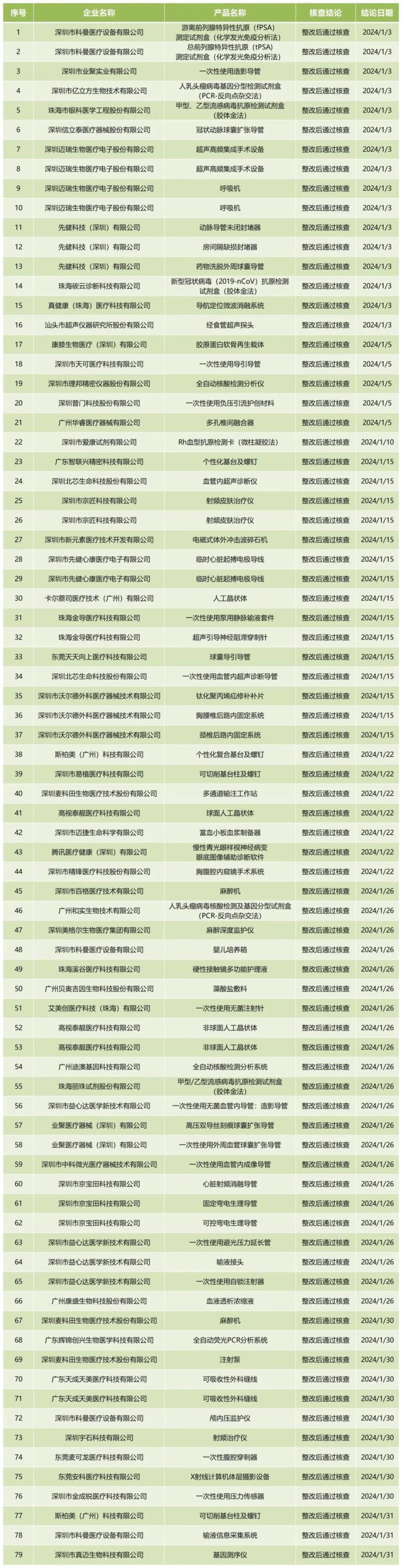 近日,廣東省藥監(jiān)局官網(wǎng)公布2024年1月醫(yī)療器械注冊(cè)質(zhì)量管理體系核查結(jié)果,包括深圳市科曼醫(yī)療設(shè)備有限公司、深圳市宗匠科技有限公司、深圳市中科微光醫(yī)療器械技術(shù)有限公司在內(nèi)的53家企業(yè)共計(jì)79款產(chǎn)品,均為“整改后通過(guò)核查”。具體明細(xì)見(jiàn)下方表格: