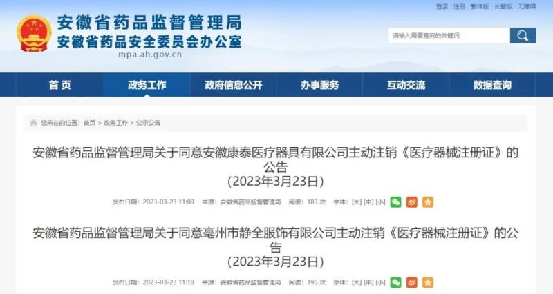 近日,安徽省藥監(jiān)局官網(wǎng)發(fā)布兩則公告,對(duì)安徽康泰醫(yī)療器具有限公司及亳州市靜全服飾有限公司持有的《醫(yī)療器械注冊(cè)證》依法予以注銷,具體明細(xì)如下:
