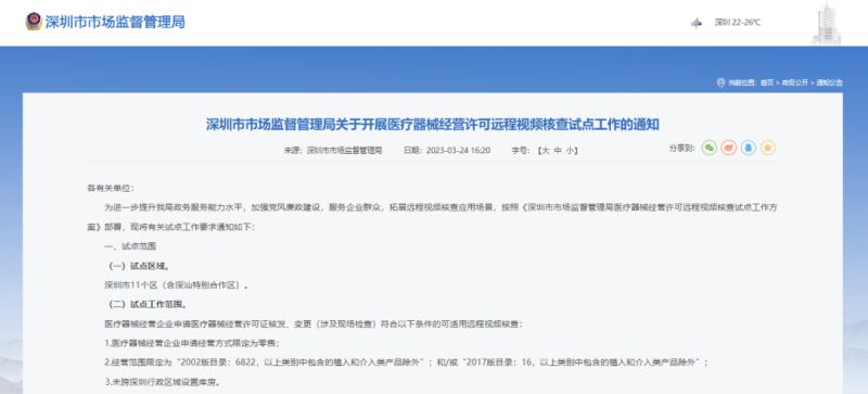 3月24日,深圳市市場(chǎng)監(jiān)督管理局發(fā)布《關(guān)于開(kāi)展醫(yī)療器械經(jīng)營(yíng)許可遠(yuǎn)程視頻核查試點(diǎn)工作的通知》,具體內(nèi)容如下: