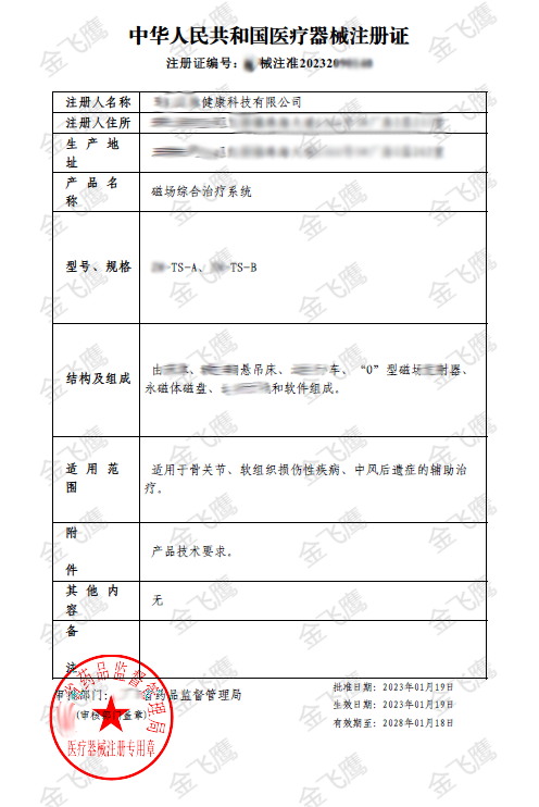 前些天我們跟大家分享了穴位磁療貼的成功案例,接上期內(nèi)容,今天的主角依然是磁療,產(chǎn)品則是更為復(fù)雜的磁場綜合治療系統(tǒng)。前段時(shí)間,金飛鷹輔導(dǎo)一家企業(yè)成功取得了磁場綜合治療系統(tǒng)的注冊(cè)證,如下圖?
