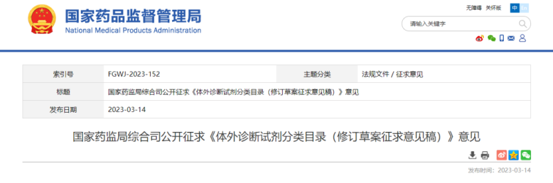 3月14日,國家藥監(jiān)局官網(wǎng)發(fā)布公告稱,為貫徹落實新修訂的《醫(yī)療器械監(jiān)督管理條例》《體外診斷試劑注冊與備案管理辦法》及《體外診斷試劑分類規(guī)則》中體外診斷試劑分類管理的要求,夯實體外診斷試劑分類管理基礎,國家藥監(jiān)局組織開展了《體外診斷試劑分類目錄》修訂工作,形成了《體外診斷試劑分類目錄(修訂草案征求意見稿)》(以下簡稱《征求意見稿》),并向社會公開征求意見。