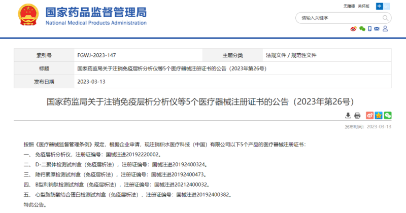 3月13日,國(guó)家藥監(jiān)局官網(wǎng)發(fā)布公告稱,按照《醫(yī)療器械監(jiān)督管理?xiàng)l例》規(guī)定,根據(jù)企業(yè)申請(qǐng),注銷積水醫(yī)療科技(中國(guó))有限公司的免疫層析分析儀等5個(gè)產(chǎn)品的醫(yī)療器械注冊(cè)證,具體如下: