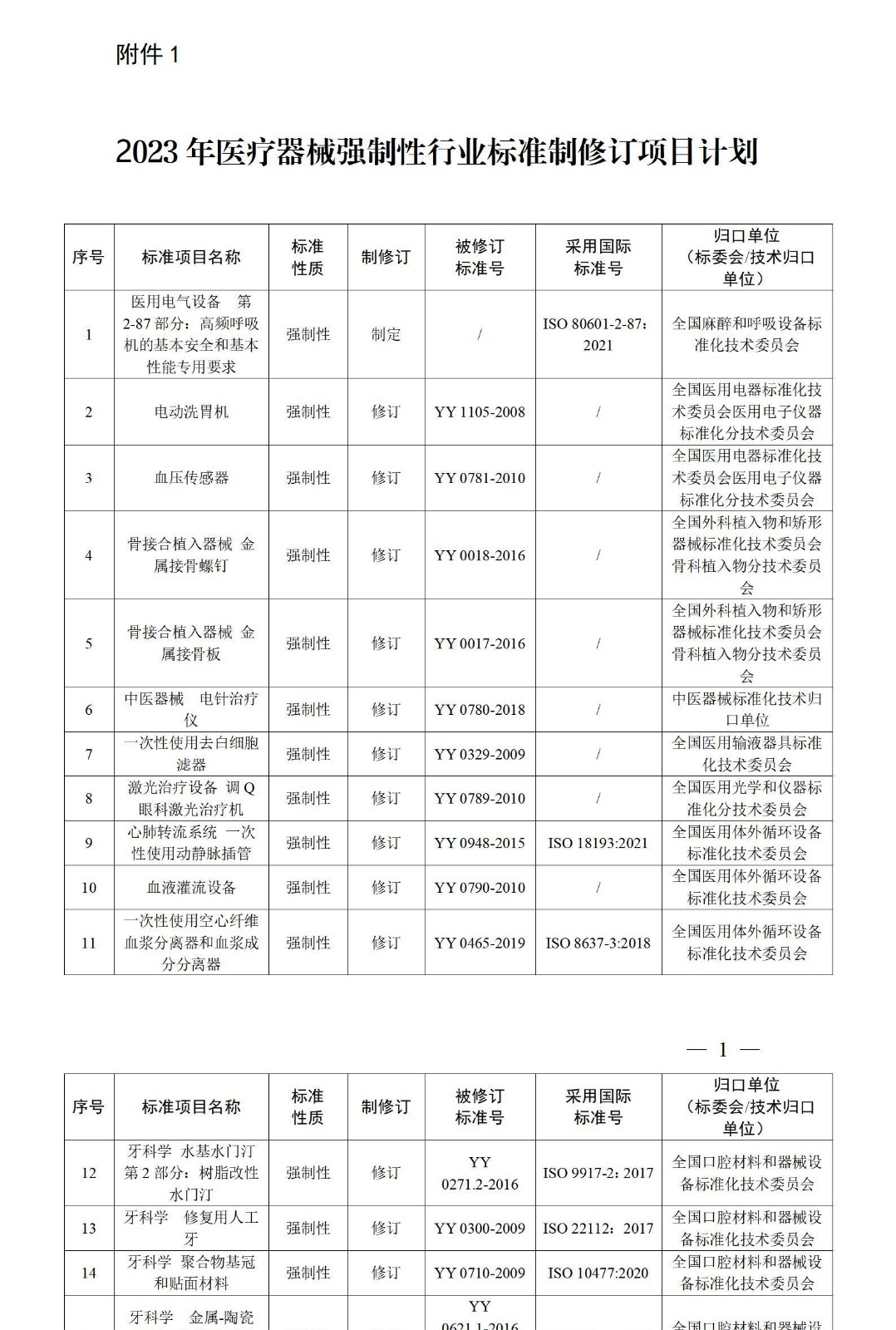 近日,國家藥監(jiān)局官網(wǎng)發(fā)布2023年醫(yī)療器械行業(yè)標準制修訂計劃,其中包括15項強制性標準(1項制定14項修訂)和102項推薦性標準(56項制定46項修訂),具體如下: