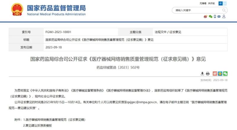 9月18日,國(guó)家藥監(jiān)局官網(wǎng)發(fā)布《醫(yī)療器械網(wǎng)絡(luò)銷售質(zhì)量管理規(guī)范(征求意見(jiàn)稿)》(以下簡(jiǎn)稱《管理規(guī)范》),并向社會(huì)公開(kāi)征求意見(jiàn)。