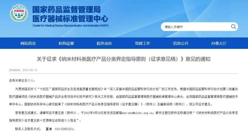 近日,國(guó)家藥監(jiān)局醫(yī)療器械標(biāo)準(zhǔn)管理中心官網(wǎng)發(fā)布《納米材料醫(yī)療產(chǎn)品分類(lèi)界定指導(dǎo)原則(征求意見(jiàn)稿)》,具體內(nèi)容如下: