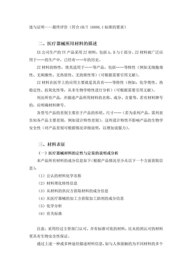 撰寫生物學(xué)評價報告時,可從醫(yī)療器械生物學(xué)評價的策略與所含程序、醫(yī)療器械所用材料的描述、材料表征、選擇或放棄生物學(xué)試驗的理由與論證、已有數(shù)據(jù)與試驗結(jié)果的匯總、完成生物學(xué)評價所需的其他數(shù)據(jù)、總結(jié)七個方面分別進行闡述,我們將報告模板部分內(nèi)容展示如下: