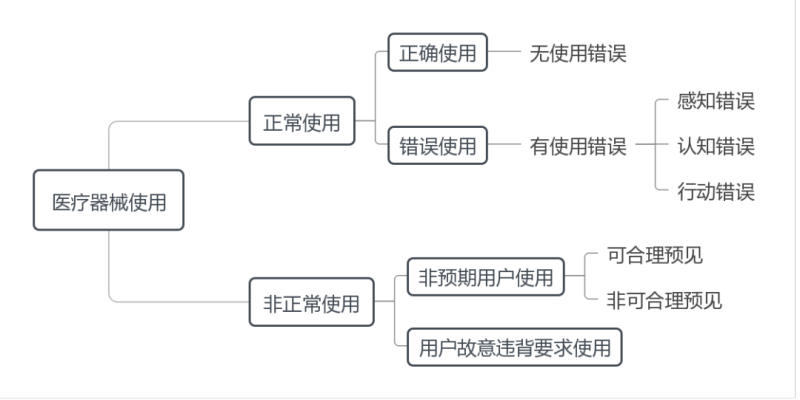 正常使用從使用結(jié)果角度可分為正確使用和錯(cuò)誤使用,其中正確使用是指沒(méi)有錯(cuò)誤使用的正常使用,其產(chǎn)生的風(fēng)險(xiǎn)均可接受;錯(cuò)誤使用是指用戶行動(dòng)或行動(dòng)缺失導(dǎo)致異于注冊(cè)申請(qǐng)人或用戶所預(yù)期的醫(yī)療器械響應(yīng),其可能降低醫(yī)療器械的有效性或者產(chǎn)生不可接受的風(fēng)險(xiǎn),導(dǎo)致患者、用戶或相關(guān)人員受到傷害或死亡。
