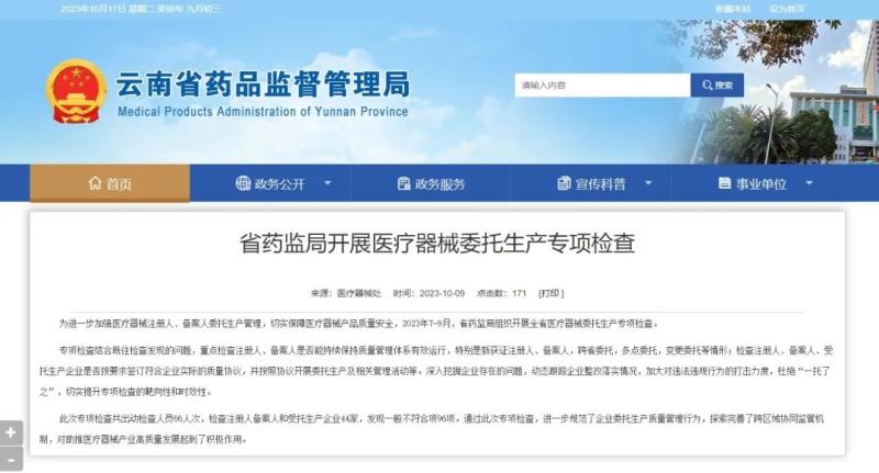 近日,云南省藥監(jiān)局官網(wǎng)發(fā)布動(dòng)態(tài)稱,2023年7-9月,該局組織開(kāi)展了全省醫(yī)療器械委托生產(chǎn)專項(xiàng)檢查。