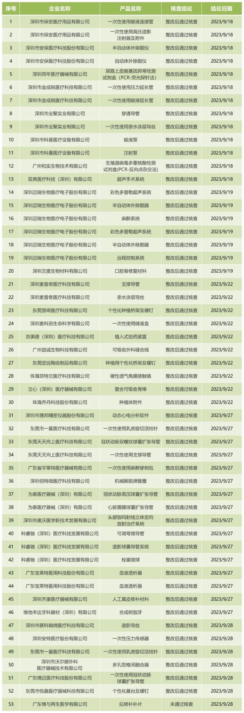 10月24日,廣東省藥監(jiān)局官網(wǎng)公布2023年9月醫(yī)療器械注冊(cè)質(zhì)量管理體系核查結(jié)果,包括深圳邁瑞生物醫(yī)療電子股份有限公司、深圳市金成銳醫(yī)療科技有限公司、深圳市科曼醫(yī)療設(shè)備有限公司在內(nèi)的36家公司共計(jì)53款產(chǎn)品,其中52款產(chǎn)品為“整改后通過核查”,有一款產(chǎn)品未通過核查。具體明細(xì)見下方表格: