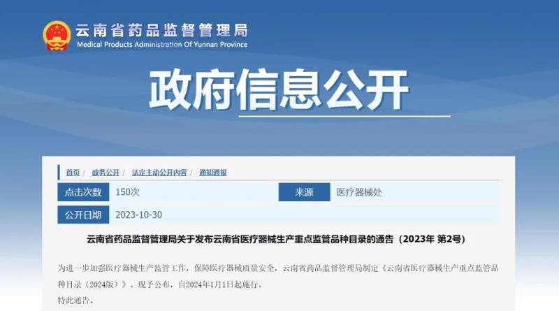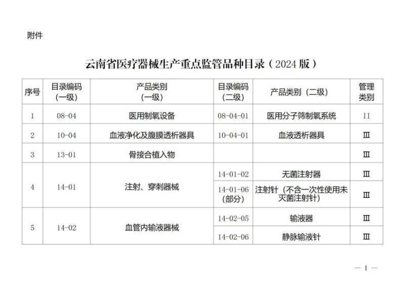 10月30日,云南省藥監(jiān)局官網公布《云南省醫(yī)療器械生產重點監(jiān)管品種目錄(2024版)》(以下簡稱《目錄》),其中包括醫(yī)用分子篩制氧系統(tǒng)、創(chuàng)面敷貼等7種Ⅱ類產品及血液透析器具、無菌注射器等9種Ⅲ類產品。《目錄》自2024年1月1日起施行,以下為具體清單: