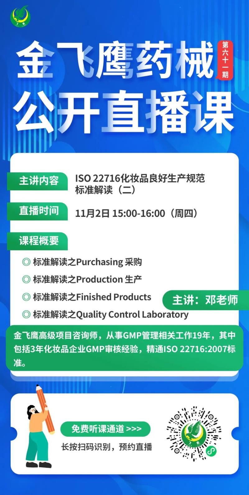 11月2日下午3點,金飛鷹高級項目咨詢師,從事GMP管理相關(guān)工作19年,其中包括3年化妝品企業(yè)GMP審核經(jīng)驗的鄧老師,給大家?guī)?/span>《ISO 22716化妝品良好生產(chǎn)規(guī)范標準解讀(二)》,繼續(xù)給大家詳細解讀標準的采購、生產(chǎn)、成品、外包、投訴和召回等版塊,大家千萬不要錯過了哦!