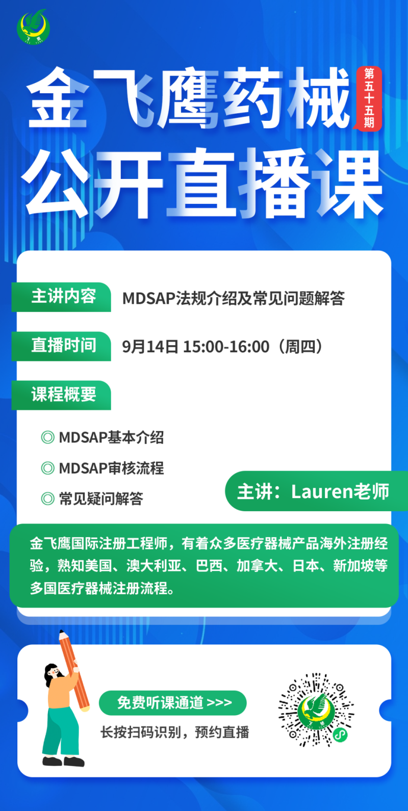 9月14日下午3點,金飛鷹國際注冊工程師,有著眾多醫(yī)療器械產品海外注冊經驗,熟知美國、澳大利亞、巴西、日本等多國注冊流程的Lauren老師,給大家?guī)怼禡DSAP法規(guī)介紹及常見問題解答》,培訓內容包括MDSAP基本介紹、MDSAP審核流程以及常見問題解答等,大家千萬不要錯過了哦!
