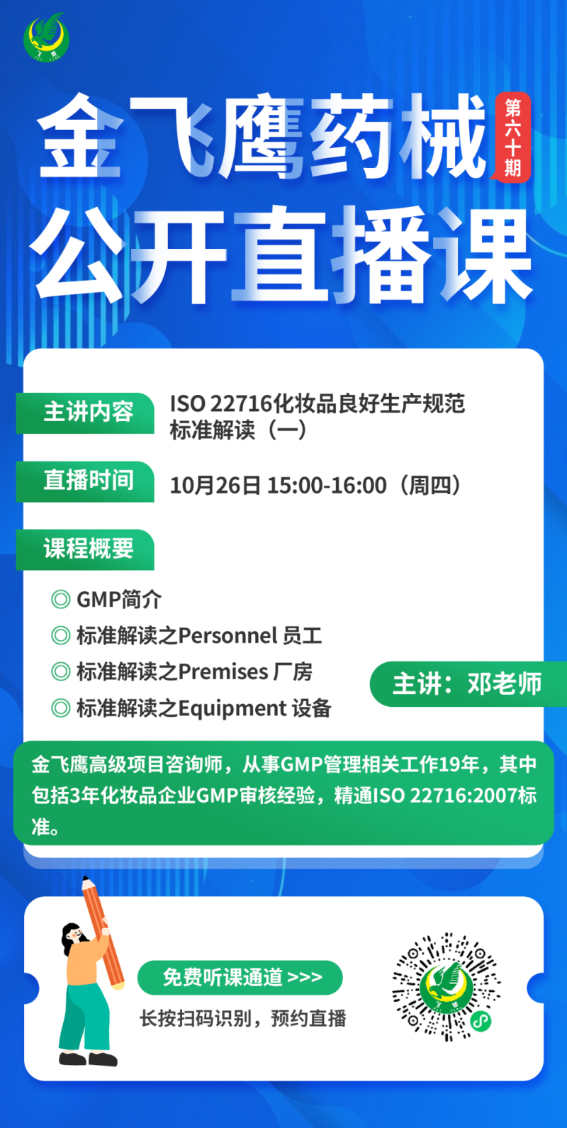 10月26日下午3點,金飛鷹高級項目咨詢師,從事GMP管理相關(guān)工作19年,其中包括3年化妝品企業(yè)GMP審核經(jīng)驗的鄧老師,給大家?guī)?/span>《ISO 22716化妝品良好生產(chǎn)規(guī)范標準解讀(一)》,培訓(xùn)內(nèi)容包括GMP簡介、標準解讀(員工、廠房及設(shè)備),大家千萬不要錯過了哦!