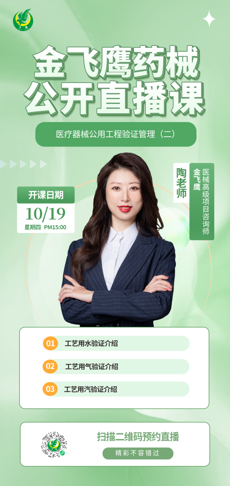 10月19日下午3點,金飛鷹高級項目咨詢師,有著15年工廠管理、7年質(zhì)量經(jīng)理及廠長經(jīng)驗,曾主導(dǎo)多個Ⅱ類&Ⅲ類醫(yī)療器械廠房項目建設(shè)的陶老師,繼續(xù)給大家?guī)?/span>《醫(yī)療器械公用工程驗證管理(二)》,培訓(xùn)內(nèi)容包括工藝用水驗證介紹、工藝用氣驗證介紹、工藝用汽驗證介紹等,大家千萬不要錯過了哦!