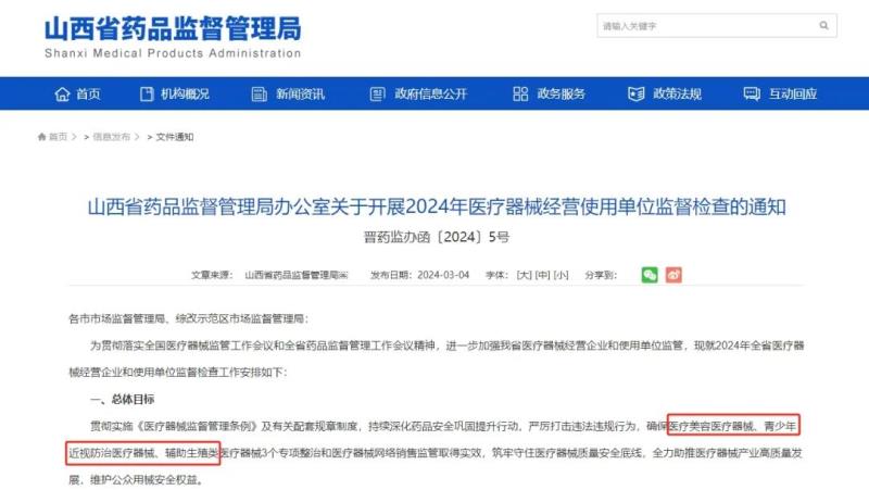 2024年醫(yī)械大檢查在各地逐步推進(jìn),3月4日,山西省藥監(jiān)局發(fā)布《關(guān)于開展2024年醫(yī)療器械經(jīng)營(yíng)使用單位監(jiān)督檢查的通知》,醫(yī)療美容、輔助生殖、青少年近視防治、無菌和植入等領(lǐng)域的相關(guān)醫(yī)療器械為檢查的重點(diǎn)品種。