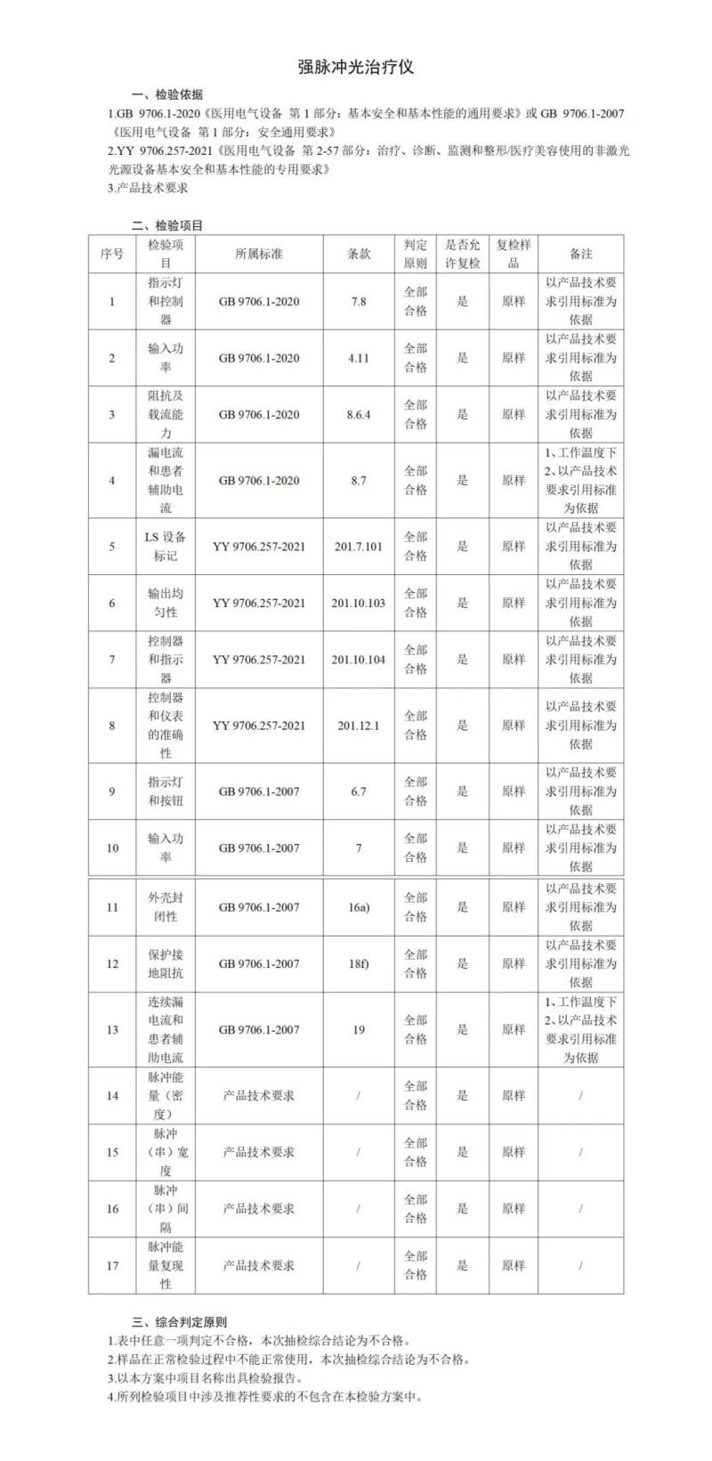 其中針對(duì)強(qiáng)脈沖光治療儀,國(guó)家藥監(jiān)局共提出了漏電流和患者輔助電流、LS設(shè)備標(biāo)記、輸出均勻性、脈沖(串)寬度、脈沖(串)間隔等17個(gè)檢驗(yàn)項(xiàng)目,同時(shí)指出,任意一項(xiàng)判定不合格,抽檢綜合結(jié)論即為不合格。具體如下: