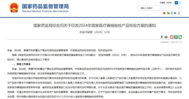 3月19日,國(guó)家藥監(jiān)局官網(wǎng)發(fā)布《2024年國(guó)家醫(yī)療器械抽檢產(chǎn)品檢驗(yàn)方案》,強(qiáng)脈沖光治療儀、醫(yī)用脈搏血氧儀、醫(yī)用分子篩制氧機(jī)、超聲治療設(shè)備、水膠體敷料等66個(gè)品種被納入抽檢品種名單。