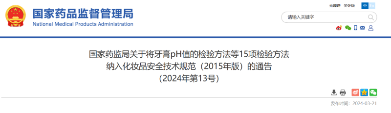 近日,國家藥監(jiān)局發(fā)布了關(guān)于將牙膏pH值的檢驗方法等15項檢驗方法納入《化妝品安全技術(shù)規(guī)范(2015年版)》的通告(2024年第13號)