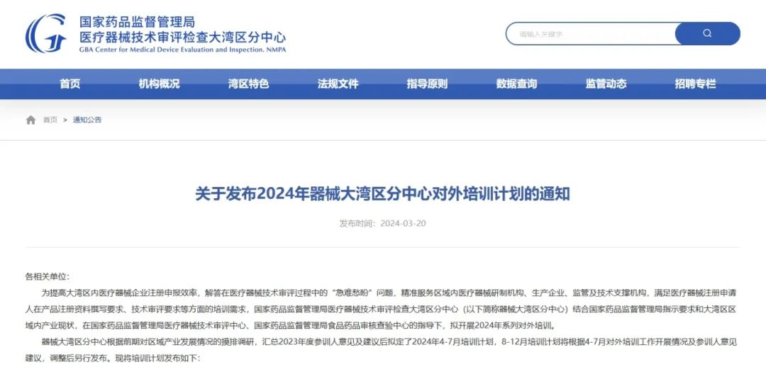 近日,國家藥監(jiān)局醫(yī)療器械技術(shù)審評檢查大灣區(qū)分中心發(fā)布2024年器械大灣區(qū)分中心對外培訓計劃,公開了2024年4-7月培訓計劃(公益培訓),具體如下:
