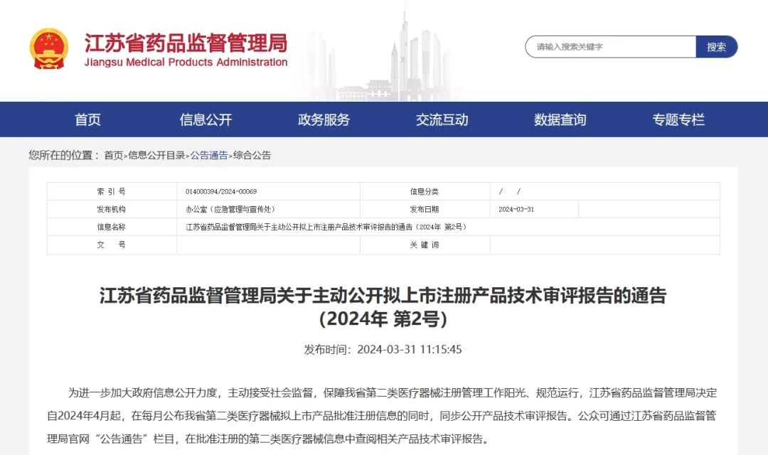 近日,江蘇省藥監(jiān)局發(fā)布通告稱,自2024年4月起,在每月公布江蘇省第二類醫(yī)療器械擬上市產(chǎn)品批準(zhǔn)注冊信息的同時,同步公開產(chǎn)品技術(shù)審評報告。公眾可通過江蘇省藥品監(jiān)督管理局官網(wǎng)“公告通告”欄目,在批準(zhǔn)注冊的第二類醫(yī)療器械信息中查閱相關(guān)產(chǎn)品技術(shù)審評報告。