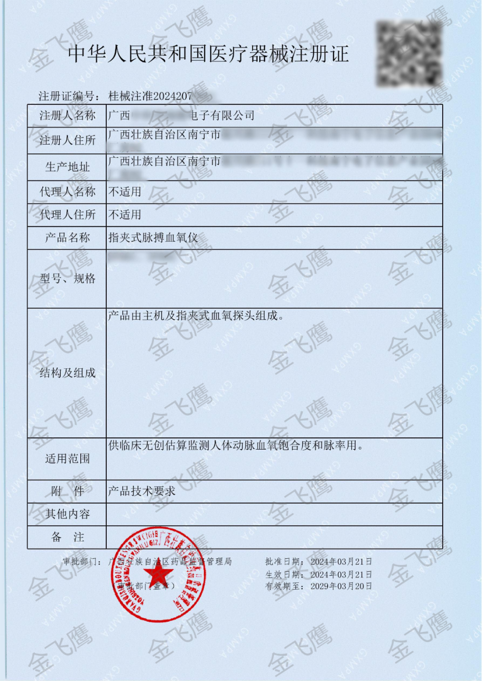 近日,金飛鷹成功輔導(dǎo)廣西一家企業(yè)取得了【指夾式脈搏血氧儀】的注冊證,借此機(jī)會,我們又給大家?guī)硪徊ㄑ鮾x產(chǎn)品的注冊干貨。