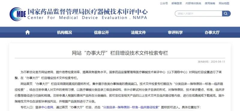4月11日,國(guó)家藥監(jiān)局器審中心發(fā)布公告稱(chēng),對(duì)網(wǎng)站欄目設(shè)置進(jìn)行了調(diào)整,在“辦事大廳”欄目增設(shè)技術(shù)文件檢索專(zhuān)欄。