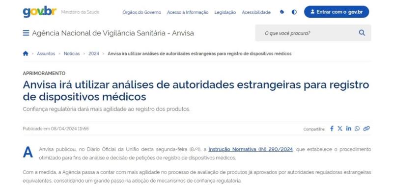 近日,Anvisa發(fā)布第290/2024號規(guī)范性指令,規(guī)定了審核和決定醫(yī)療器械注冊申請的簡化程序:經(jīng)認(rèn)可的海外監(jiān)管機(jī)構(gòu)(澳洲、加拿大、美國、日本)授權(quán)上市的Class Ⅲ、Class Ⅳ類高風(fēng)險醫(yī)療器械,可根據(jù)公司的申請縮短其在巴西注冊的審核時間。此簡化程序的申請需提交相關(guān)文件,以證明進(jìn)入巴西市場的產(chǎn)品與經(jīng)認(rèn)可的監(jiān)管機(jī)構(gòu)批準(zhǔn)的產(chǎn)品有著相同的生產(chǎn)特征、適應(yīng)癥和預(yù)期用途。