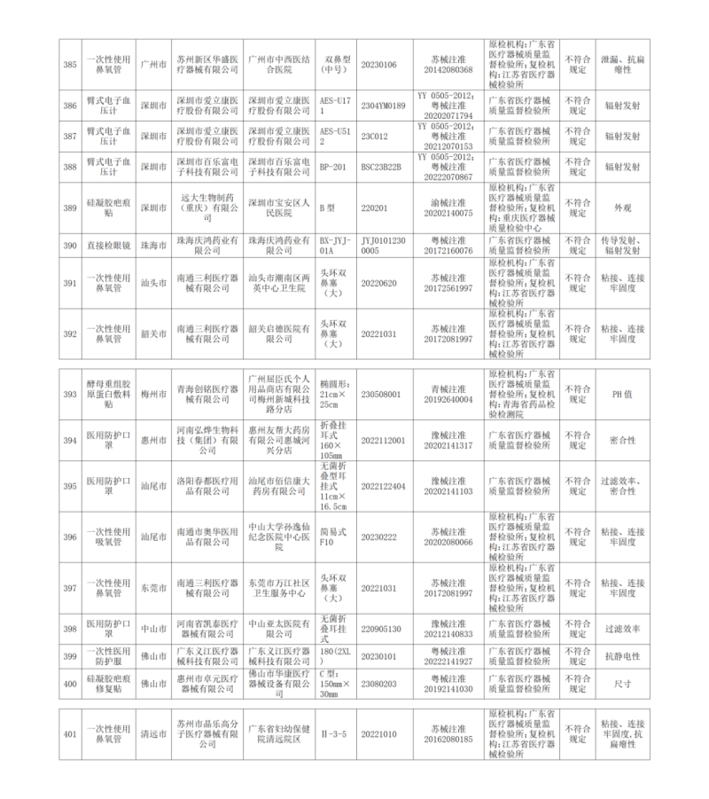 4月26日,廣東藥監(jiān)局發(fā)布《關(guān)于醫(yī)療器械抽查檢驗(yàn)信息的通告(2024年第2期,總第87期)》,我們通過(guò)查看通告中的附件發(fā)現(xiàn),本次共抽查檢驗(yàn)了401批次產(chǎn)品,其中有17批次不符合規(guī)定,包括硅凝膠疤痕貼、酵母重組膠原蛋白敷料貼、一次性使用鼻氧管、醫(yī)用防護(hù)口罩等產(chǎn)品,不符合規(guī)定產(chǎn)品具體明細(xì)如下:
