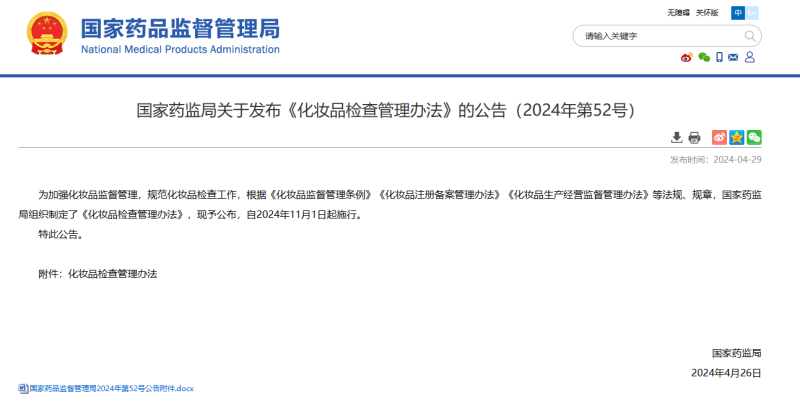 近日,國家藥監(jiān)局發(fā)布《化妝品監(jiān)督管理辦法》。這是我國化妝品監(jiān)管領域第一次系統(tǒng)地規(guī)范化妝品檢查工作,自2024年11月1日開始實施。