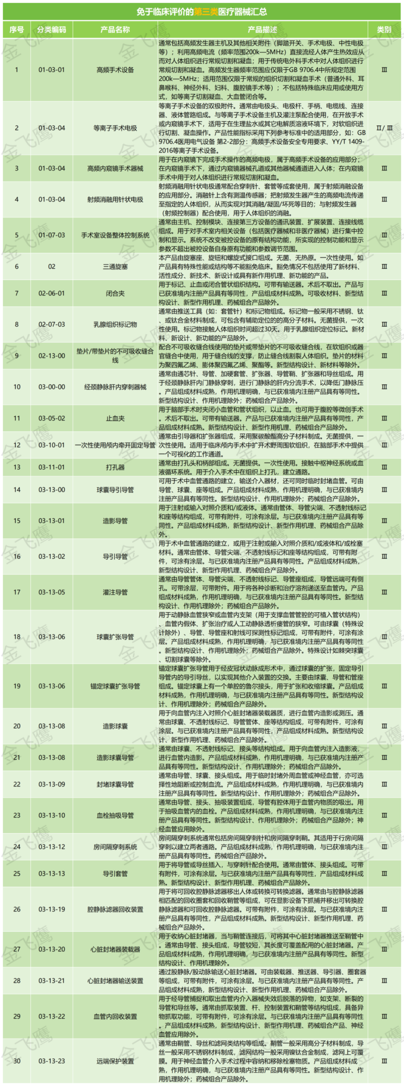 根據(jù)國(guó)家藥監(jiān)局發(fā)布的《免于進(jìn)行臨床評(píng)價(jià)醫(yī)療器械目錄(2023年)》,我們篩選出了免于進(jìn)行臨床評(píng)價(jià)的第三類(lèi)醫(yī)療器械產(chǎn)品(共204類(lèi)產(chǎn)品),部分展示如下: