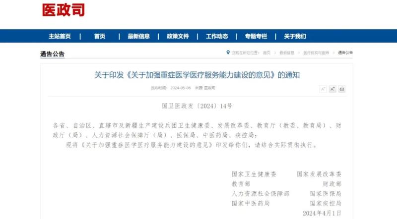 近日,大規(guī)模設備更新工作加速推進,醫(yī)療器械行業(yè)再迎利好政策。5月6日,國家衛(wèi)健委等八部門印發(fā)《關于加強重癥醫(yī)學醫(yī)療服務能力建設的意見》的通知。意見提出,到2025年末,全國重癥醫(yī)學床位達到15張/10萬人,可轉(zhuǎn)換重癥醫(yī)學床位達到10張/10萬人,相關醫(yī)療機構綜合ICU床醫(yī)比達到1:0.8,床護比達到1:3。到2027年末,全國重癥醫(yī)學床位達到18張/10萬人,可轉(zhuǎn)換重癥醫(yī)學床位達到12張/10萬人,重癥醫(yī)學醫(yī)療服務資源有效擴容,區(qū)域布局更加均衡,??品漳芰︼@著提升。