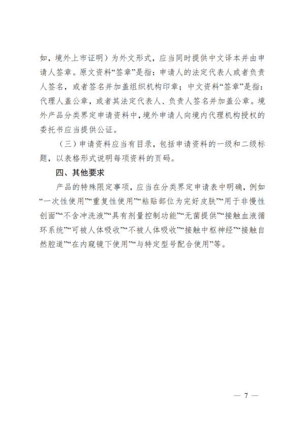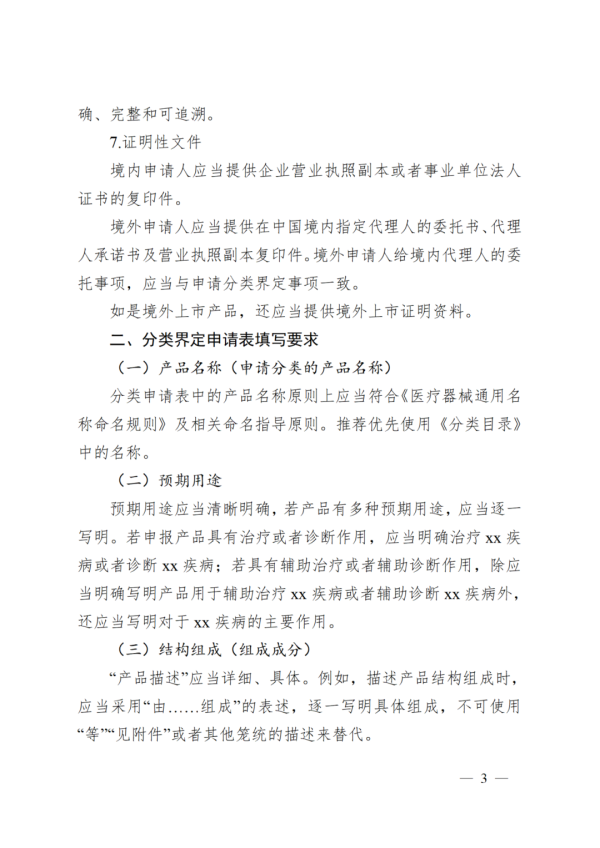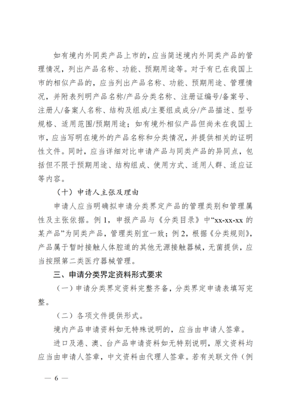 一、關于分類界定工作 (一)藥品監(jiān)督管理部門應當向醫(yī)療器械注冊申請人、備案人等提供醫(yī)療器械分類界定服務。醫(yī)療器械分類界定是藥品監(jiān)督管理部門根據(jù)申請人提供的資料,依據(jù)《醫(yī)療器械監(jiān)督管理條例》(以下簡稱《條例》)《醫(yī)療器械注冊與備案管理辦法》《體外診斷試劑注冊與備案管理辦法》(以下統(tǒng)稱《辦法》)《醫(yī)療器械分類規(guī)則》《體外診斷試劑分類規(guī)則》(以下統(tǒng)稱《分類規(guī)則》)、相關分類界定指導原則及《醫(yī)療器械分類目錄》《第一類醫(yī)療器械產(chǎn)品目錄》《體外診斷試劑分類目錄》(以下統(tǒng)稱《分類目錄》)等,基于現(xiàn)階段科學認知和共識,并參考國際國內(nèi)醫(yī)療器械分類實踐,綜合考慮醫(yī)療器械的預期目的、結(jié)構(gòu)組成、使用方法、工作原理等因素,對醫(yī)療器械風險程度進行評價,判定醫(yī)療器械的管理類別。 (二)申請人應當依據(jù)《條例》《辦法》《分類規(guī)則》、相關分類界定指導原則及《分類目錄》等判定產(chǎn)品管理屬性和類別。對新研制的尚未列入《分類目錄》的醫(yī)療器械,申請人可以直接申請第三類醫(yī)療器械產(chǎn)品注冊,也可以依據(jù)《分類規(guī)則》判斷產(chǎn)品類別并申請分類界定后,申請產(chǎn)品注冊或者辦理產(chǎn)品備案。 對于新研制的尚未列入《分類目錄》的醫(yī)療器械或者管理類別存疑的醫(yī)療器械,需要藥品監(jiān)管部門明確分類界定意見從而申請注冊或者辦理備案的,申請人應當通過分類界定信息系統(tǒng)提出分類界定申請。申請人應當已完成產(chǎn)品的前期研究、具有基本定型產(chǎn)品,并確保分類界定申請資料的合法、真實、準確、完整和可追溯。 新研制的尚未列入《分類目錄》的醫(yī)療器械,是指與《分類目錄》中產(chǎn)品(根據(jù)產(chǎn)品描述、預期用途和品名舉例進行綜合判定)和已上市產(chǎn)品相比,產(chǎn)品的主要原材料、生產(chǎn)工藝、工作原理、結(jié)構(gòu)組成、使用方法、接觸部位及接觸時間、預期目的等均為全新且尚未在我國上市的醫(yī)療器械。 管理類別存疑的醫(yī)療器械,是指同類產(chǎn)品已在我國上市或者已列入《分類目錄》,但與《分類目錄》中同類產(chǎn)品或者已上市同類產(chǎn)品相比,產(chǎn)品的主要原材料、生產(chǎn)工藝、工作原理、結(jié)構(gòu)組成、使用方法、接觸部位及接觸時間、預期目的等發(fā)生了變化,引入了新的風險或者增加了產(chǎn)品風險,可能導致產(chǎn)品分類發(fā)生變化的醫(yī)療器械。 (三)對于新研制的尚未列入《分類目錄》的醫(yī)療器械分類界定申請,申請人在分類界定信息系統(tǒng)中提交至國家藥品監(jiān)督管理局醫(yī)療器械標準管理中心(以下簡稱器械標管中心)。 器械標管中心負責組織研究明確分類界定意見,通過分類界定信息系統(tǒng)將分類界定結(jié)果告知申請人,并及時按照程序調(diào)整《醫(yī)療器械分類目錄》。 (四)對于管理類別存疑的境內(nèi)醫(yī)療器械分類界定申請,申請人在分類界定信息系統(tǒng)中提交至所在地省級藥品監(jiān)督管理部門。省級藥品監(jiān)督管理部門負責對行政區(qū)域內(nèi)申請人提出的產(chǎn)品分類界定申請進行審查,根據(jù)《條例》《分類規(guī)則》、相關分類界定指導原則及《分類目錄》等能夠明確判定產(chǎn)品管理類別的,通過分類界定信息系統(tǒng)將分類界定結(jié)果告知申請人;難以明確判定產(chǎn)品管理類別的,提出預分類界定意見,并通過分類界定信息系統(tǒng)報器械標管中心。 器械標管中心與國家藥品監(jiān)督管理局醫(yī)療器械技術審評中心(以下簡稱國家藥監(jiān)局器審中心)、省級藥品監(jiān)督管理部門建立醫(yī)療器械分類溝通協(xié)調(diào)機制,統(tǒng)籌指導省級藥品監(jiān)督管理部門醫(yī)療器械分類界定工作。 對于管理類別存疑的進口及港、澳、臺產(chǎn)品醫(yī)療器械分類界定申請,申請人在分類界定信息系統(tǒng)中提交至器械標管中心。 器械標管中心負責對管理類別存疑的進口及港、澳、臺產(chǎn)品醫(yī)療器械分類界定申請和省級藥品監(jiān)督管理部門出具預分類界定意見的醫(yī)療器械分類界定申請組織研究,明確分類界定意見,并通過分類界定信息系統(tǒng)將分類界定結(jié)果告知申請人。 (五)醫(yī)療器械分類技術委員會按照《國家藥品監(jiān)督管理局醫(yī)療器械分類技術委員會工作規(guī)則》相關規(guī)定,開展醫(yī)療器械(含體外診斷試劑)分類及相關工作,為醫(yī)療器械分類管理工作提供技術支撐。 (六)申請人、各省級藥品監(jiān)督管理部門、各級醫(yī)療器械技術審評部門等可登錄分類界定信息系統(tǒng)查詢分類界定結(jié)果。分類界定信息系統(tǒng)告知的產(chǎn)品分類界定結(jié)果,僅供申請醫(yī)療器械注冊或者辦理備案時使用;若注冊或者備案產(chǎn)品資料中的相關內(nèi)容(如主要原材料、生產(chǎn)工藝、工作原理、結(jié)構(gòu)組成、使用方法、接觸部位及接觸時間、預期目的等)與分類界定申請資料或者分類界定申請告知書不一致,則分類界定結(jié)果不適用。 申請人若對其產(chǎn)品分類界定結(jié)果有異議