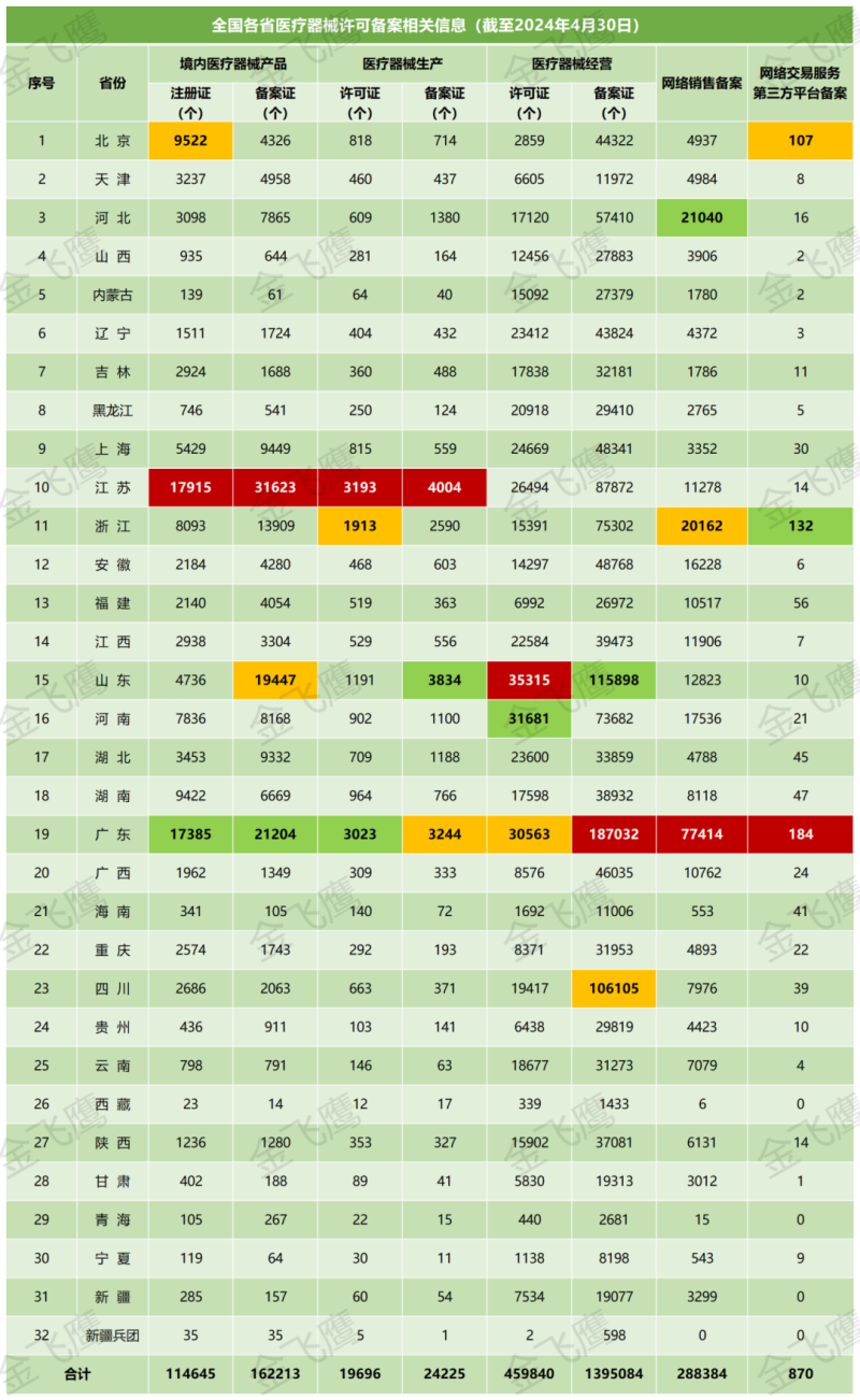 5月13日,國(guó)家藥監(jiān)局公布了截至2024年4月30日各省有效期內(nèi)醫(yī)療器械產(chǎn)品注冊(cè)備案、醫(yī)療器械生產(chǎn)企業(yè)許可備案等信息,老規(guī)矩,金飛鷹小編對(duì)此稍作編輯,標(biāo)注紅色、綠色、黃色的分別為前三甲。