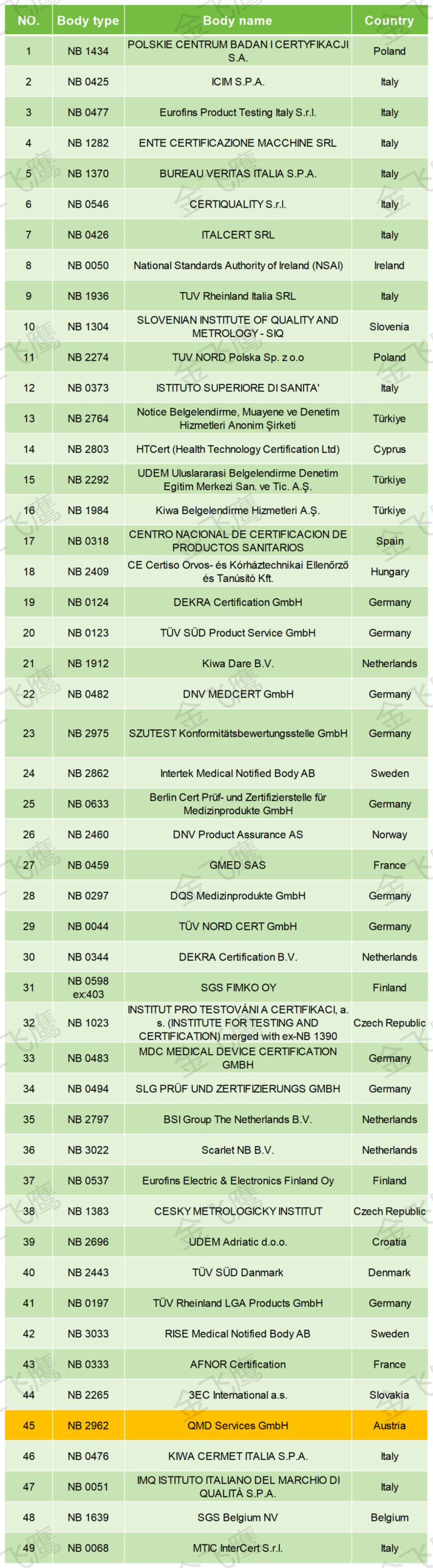 迄今為止,歐盟MDR公告機(jī)構(gòu)共有49家,其中意大利的公告機(jī)構(gòu)最多(11家),其次是德國(10家),第三則為荷蘭(共4家)。我們將所有歐盟MDR公告機(jī)構(gòu)名單匯總如下(標(biāo)注為黃色的即為本次新增):