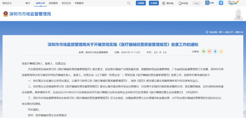 一、各經(jīng)營企業(yè)應(yīng)強(qiáng)化主體責(zé)任落實(shí),認(rèn)真學(xué)習(xí)新修訂的《規(guī)范》,按照《規(guī)范》要求建立健全質(zhì)量管理體系并保證其有效運(yùn)行。 二、各經(jīng)營企業(yè)應(yīng)根據(jù)新修訂的《規(guī)范》要求認(rèn)真開展自查并報(bào)送自查情況,對(duì)自查中發(fā)現(xiàn)的問題應(yīng)制定整改計(jì)劃,落實(shí)整改措施,及時(shí)消除各種質(zhì)量安全隱患。具體填報(bào)方式:企業(yè)應(yīng)在2024年6月25日前登錄深圳市醫(yī)療器械行業(yè)協(xié)會(huì)官網(wǎng)企業(yè)年檢專欄在線填報(bào)《醫(yī)療器械經(jīng)營企業(yè)自查要點(diǎn)》(詳見附件)。 三、深圳市市場(chǎng)監(jiān)督管理局將在新修訂的《規(guī)范》正式實(shí)施后,加強(qiáng)抽查經(jīng)營企業(yè)自查情況和監(jiān)督檢查,對(duì)不符合醫(yī)療器械經(jīng)營管理相關(guān)規(guī)定的企業(yè),依法查處和清理。