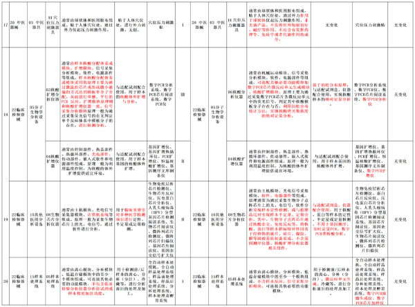 本次調(diào)整意見對20類醫(yī)療器械產(chǎn)品進(jìn)行了產(chǎn)品描述、預(yù)期用途或管理類別的調(diào)整,我們以圖片形式將其展示如下(點(diǎn)擊圖片可放大查看):