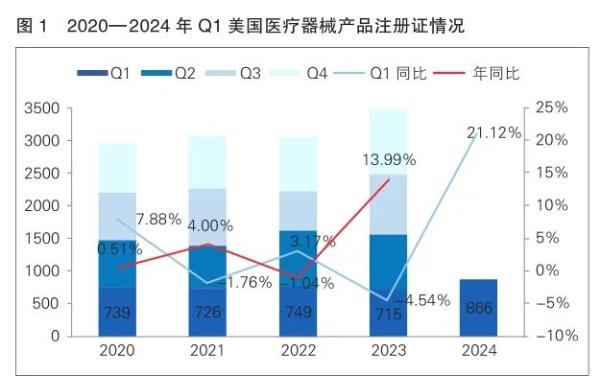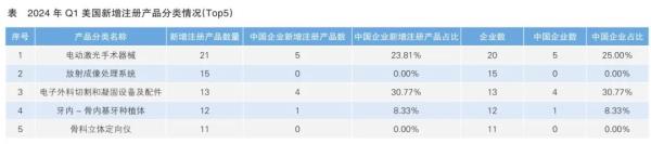 從整體注冊情況來看,2024年一季度,中國企業(yè)在美國獲批醫(yī)療器械產(chǎn)品中,“經(jīng)皮神經(jīng)電刺激儀(用于非處方用途)”的產(chǎn)品數(shù)量最多;其次是“電動激光手術器械”,產(chǎn)品數(shù)量為5件,占該分類新注冊產(chǎn)品總數(shù)的23.81%,涉及中國企業(yè)5家,占該分類注冊企業(yè)總數(shù)的25.00%。