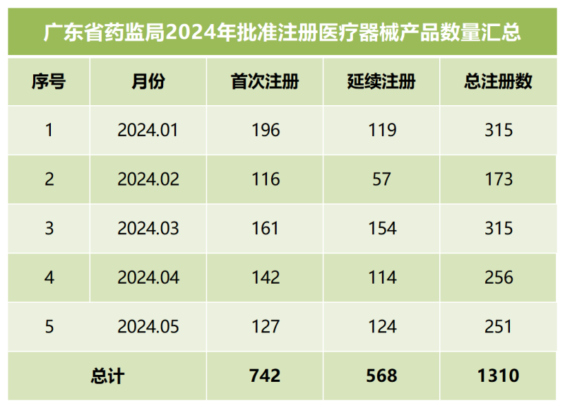 我們同步匯總了2024年前5個月廣東省藥監(jiān)局批準(zhǔn)注冊的醫(yī)療器械產(chǎn)品數(shù)量(見下方表格),從表格中可以看出,截至5月底,2024年廣東省藥監(jiān)局總計批準(zhǔn)注冊第二類醫(yī)療器械產(chǎn)品1310個,其中首次注冊742個,延續(xù)注冊568個。