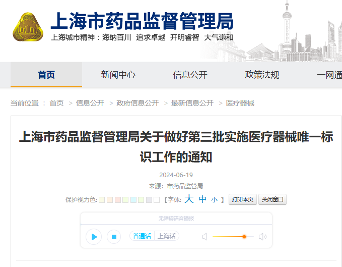 上海市藥品監(jiān)督管理局 - 2024年6月19日,發(fā)布通知提醒第三批UDI實(shí)施工作即將正式執(zhí)行-《上海市藥品監(jiān)督管理局關(guān)于做好第三批實(shí)施醫(yī)療器械唯一標(biāo)識工作的通知》