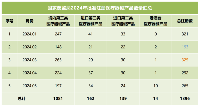 我們同步匯總了2024年前五個(gè)月國家藥監(jiān)局批準(zhǔn)注冊的醫(yī)療器械產(chǎn)品數(shù)量(見下方表格),從表格中可以看出,截至5月,2024年國家藥監(jiān)局總計(jì)批準(zhǔn)注冊醫(yī)療器械產(chǎn)品1396個(gè),其中境內(nèi)第三類醫(yī)療器械產(chǎn)品1081個(gè),進(jìn)口第三類醫(yī)療器械產(chǎn)品162個(gè),進(jìn)口第二類醫(yī)療器械產(chǎn)品139個(gè),港澳臺醫(yī)療器械產(chǎn)品14個(gè)。