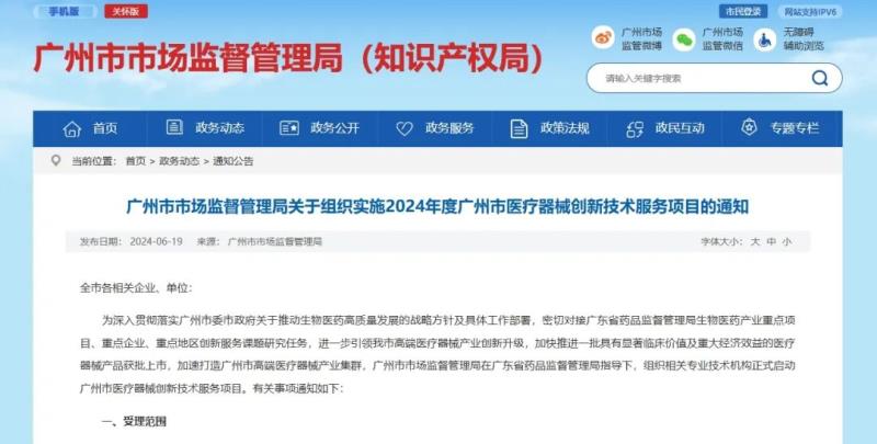 6月19日,廣州市市場監(jiān)督管理局發(fā)布《關(guān)于組織實(shí)施2024年度廣州市醫(yī)療器械創(chuàng)新技術(shù)服務(wù)項(xiàng)目的通知》(以下簡稱《通知》),《通知》指出,該局已組織相關(guān)專業(yè)技術(shù)機(jī)構(gòu)正式啟動廣州市醫(yī)療器械創(chuàng)新技術(shù)服務(wù)項(xiàng)目。具體事項(xiàng)如下: