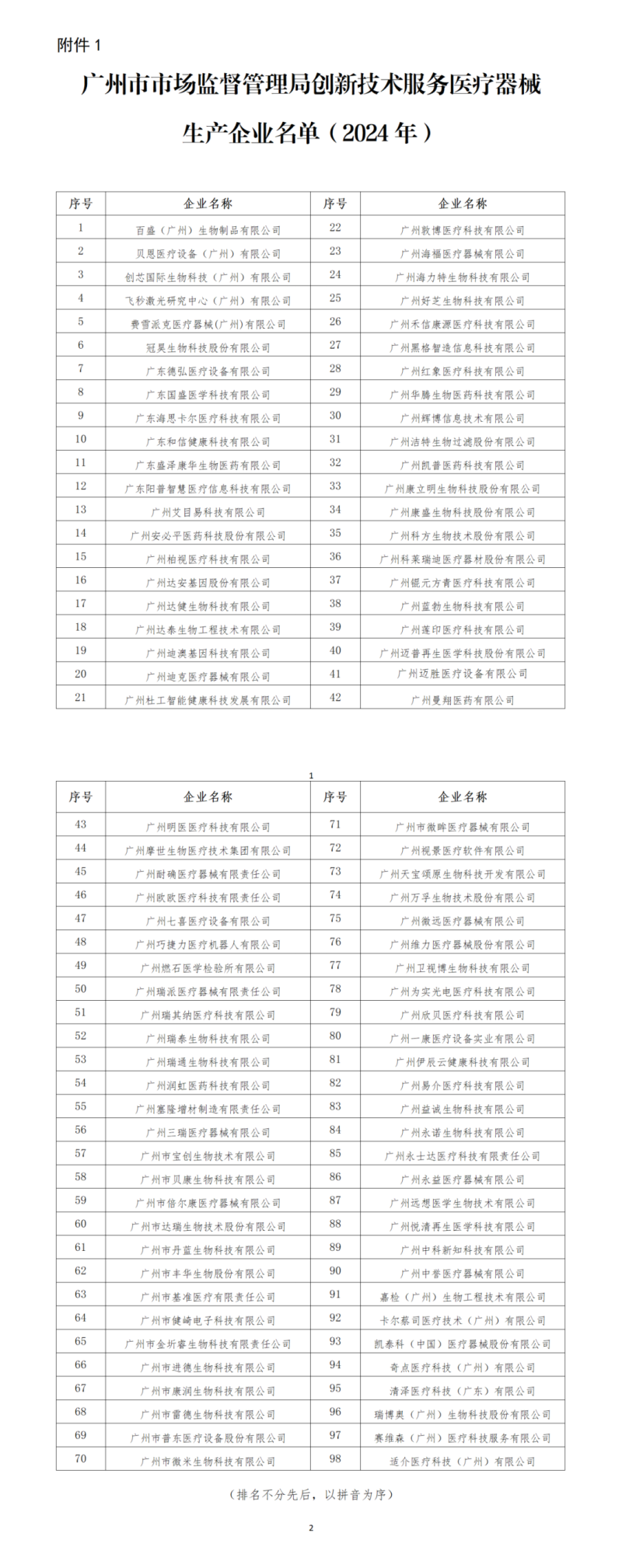 經(jīng)前期遴選,納入《廣州市市場監(jiān)督管理局創(chuàng)新技術(shù)服務(wù)醫(yī)療器械生產(chǎn)企業(yè)名單(2024年)》的企業(yè)(簡稱《名單》,見下方附件圖片),共包括廣州紅象醫(yī)療科技有限公司、廣州科萊瑞迪醫(yī)療器材股份有限公司、廣州黑格智造信息科技有限公司等98家企業(yè),原則上每家企業(yè)自主選擇不多于三個(gè)擬注冊單元。